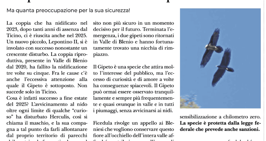 Bleniesi: abbiate cura del vostro Gipeto Il Gipeto bleniese conferma la sua presenza in valle. Ma quanta preoccupazione per la sua sicurezza! Attraverso la rivista Voce di Blenio, Ficedula rivolge un appello ai Bleniesi che vogliono conservare questo fiore all’occhiello…